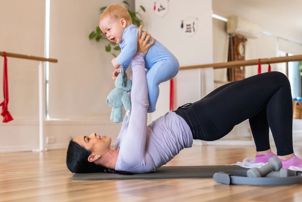 A welcoming mat Pilates class designed for real life- where caregivers can move, stretch, and strengthen while kids are welcome to be nearby.
