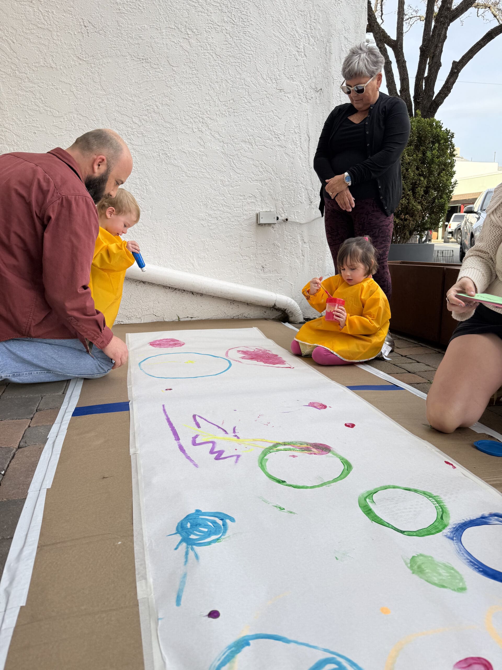 Children create together on a shared paper, exploring color, movement, and mark-making freely.