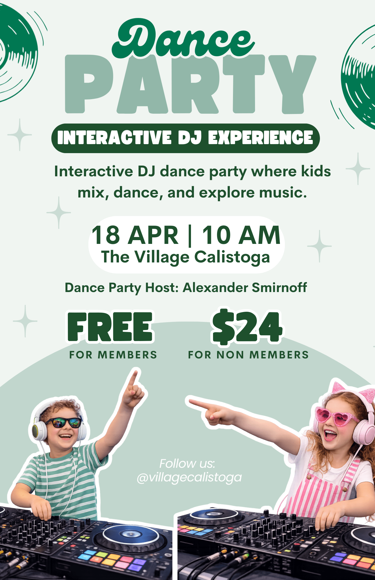 The Village Kids DJ Dance Party is a playful music experience where kids can explore rhythm, movement, and creativity.