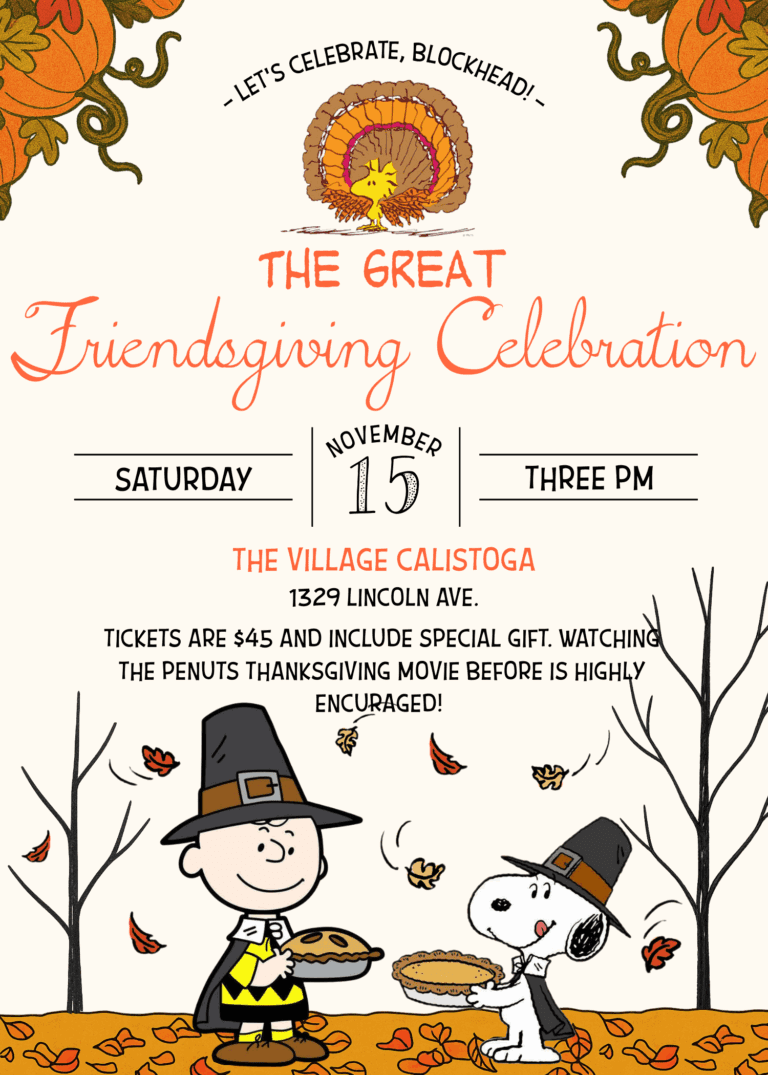 Join us for The Great Friendsgiving Celebration at The Village Calistoga! Your ticket includes a special gift and an afternoon filled with festive fun. Watching A Charlie Brown Thanksgiving beforehand is highly encouraged to get into the spirit — after all, it’s a Peanuts-inspired Friendsgiving!